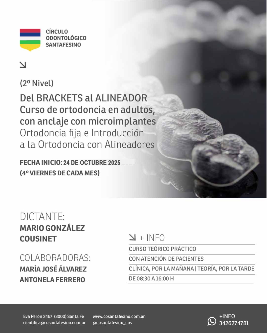 • Programa analítico: Repaso de temario referido a Ortodoncia fija. Planificación en ortodoncia. Cefalograma de Ricketts, Bjork Jarabak y Powell. Estética facial, nuevos conceptos diagnóstico. Aparatología: distintos tipos de brackets. Anclaje: definición, cómo conseguirlo, cómo evitar perderlo. Mecánica de Clase I, Clase II, Clase III. Arco utilitario, análisis y desarrollo. Arco de intrusión de Burstone, análisis y desarrollo. Cierre de espacios, casos con extracciones. Conducción distal de piezas dentarias, distalización. Stripping, desgaste interproximal. Anclaje con microimplantes e implantes ortodóncicos, casos. Sistemas de contención, fija y removible. Ortodoncia en pacientes adultos, sus límites y fronteras. Ortodoncia en pacientes periodontales. La Ortodoncia como tratamiento rehabilitador, la hermandad de la Ortodoncia con la Implantología. Biomecánica con Alineadores: características y principios biomecánicos básicos de los alineadores transparentes. Fuerzas. Movimientos. Anclaje. Flujo de Trabajo del software. Límites de movimientos dentarios. Secuencia de movimientos dentarios. Macrosecuencia de movimientos. Micro secuencia de movimientos. Revisión de la oclusión y de los contactos oclusales. Exportación de modelos. Preparación de modelos para su impresión. Ataches: Definición.Ataches activos y pasivos. Elementos del atache, superficie activa y pasiva. Indicaciones. Diseño, Ubicación, Orientación, Funciones. Prioridades en su elección. Principios básicos de planificación. Forma de las arcadas. Movimiento recíproco y principio de acción. Diferentes protocolos de movimiento.